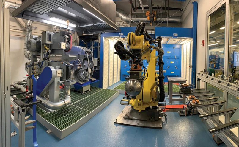 The APS robotic automation cell was built to handle just about any challenge a customer could face. The cell features a Fanuc R2000iC robot with a force sensor capable of being programmed to perform multiple tasks, including media-to-part and part-to-media solutions, plus wet/dry processing, and using various products already mentioned.