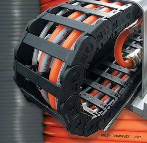 igus has also extended its scope into the robotics arena with the introduction of its multi-axis cable carrier: "Triflex R" – R for round. Triflex R was developed to protect moving cables and hoses on six-axis robots used in demanding industrial environments. The cable management system is able to move multi-dimensionally through all axes and can twist up to 380° per yard, enabling easy movement through complex configurations. The smooth, tubular design permits the cable carrier to glide around the exterior of the robot without getting caught up.