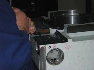 Hand-scraping is one of the ways that nano-accuracy is achieved. With more than 500 hours, on average, this pull-scraping technique of all mating surfaces – to achieve perfect match – offers the high degree of volumetric accuracy and rigidity inherent to all DIXI machines. In order to continue this learned trade, the five to six full-time scrapers work with apprentices in order for all Journeymen to scrape in the exact same way.