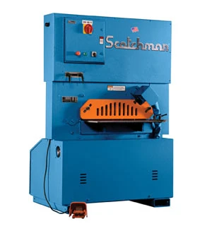 ShearMaster 610 Production Flat Bar Shear combines large capacity with many standard features turning it into a high production shear. The ShearMaster 610 has the capability of shearing 1" x 12" base plate and up to ½" x 24" flat stock. Standard features include: electric stroke control setting to reduce the travel of the upper blade, automatic hydraulic hold down, electric back gage for automatic cycle and a 10hp motor for fast cycle times. This shear is capable of 12 full strokes or 30 half strokes per minute. For the enduser who wants a totally automated shear, this machine is designed to couple with the Scotchman Advanced Feed System. The Scotchman Advanced Feed System comes complete with a programmable controller, allowing you to set up to 99 different programs. This system automatically moves your material to position and cycles the machine.