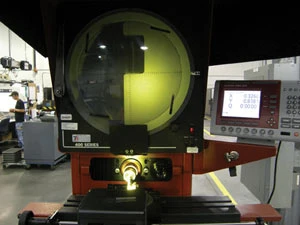 One of the busiest pieces of inspection equipment is a Starrett HD400 Horizontal Benchtop, Dual Lens, Measuring Projector, also referred to as an optical comparator. Optical measurement is a non-contact technique that graphically displays and measures parts with dimensions and shapes that would be difficult to measure with regular gages.
