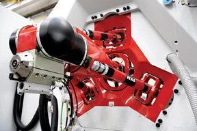 High-speed, servo-drive for the struts, created exclusively for the Tricept by SKF, enables 88.9mpm (3,500ipm) rapid traverse and 2G max acceleration/deceleration. Each strut delivers 990mm (39") stroke. The greatest Z reach is at dead center, decreasing as travel moves to outer extremes. The system design delivers ±0.038mm (0.0015") positioning accuracy and ±0.010mm (0.0004") repeatability to meet ever-tighter part tolerances.