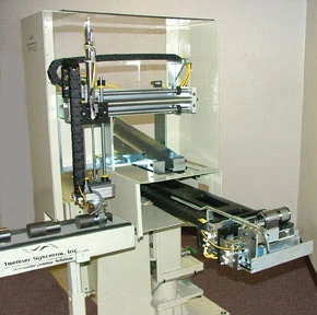 The parts automation Pick & Place transfer unit is used for running Op. 10 to Op. 20 between two CNC lathes. Toellner's design enhances the flawless transfer of Op. 10 machined parts from one servo-driven parts loading/unloading system to a second, running Op. 20 in a fast, constant and smooth automated process. After Op. 10 has finished machining, the part automatically transfers between the two cells via a Toellner conveyor system. The pick and place gripper arm assembly on cell two gathers the part, turns it around 180°, and then places the part in the nest assembly, ready for Op. 20 machining, before moving on to Op. 30 using the same technology.