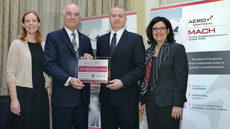 Montréal, Canada – Aéro Montréal, Québec's aerospace cluster awarded Alcoa Titanium & Engineered Products, Laval, with the MACH 5 performance label, the first company to qualify at this level. This is the highest level on a scale from 1 to 5 that a supplier can achieve under the MACH Initiative. This program aims to optimize the performance of the Québec aerospace supply chain to increase its competitiveness internationally.