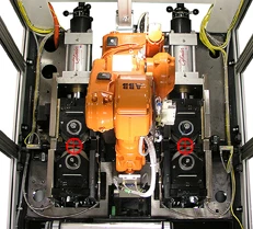 Prior to the introduction of the vertical axis PowerBox system for the aerospace industry, one of Kinefac’s automotive customers was using an MC-25 FI Kine-Roller to make ball studs in large quantities with a two step, two machine rolling process. In their system, they first rolled the thread and then transferred the part to a second machine for the roll finishing of the ball. When others became aware of the ease with which two MC-15 Kine-Roller machines are easily mounted on a common base with an integrated robot to perform the two rolling operations needed for a finished ball stud, the customer immediately decided to purchase such a machine. This provided the impetus to introduce the robot two machine integrated Robo-Roller to the aerospace industry. At the same time, the integration of the robot to the MC-15 FI Kine-Roller provided a cost effective method of warm rolling. In this simple application, the robot grasped the blank from an input track or tray, heated the area to be rolled, rolled the thread, and deposited the completed part in an output trough for cooling.