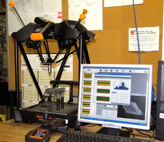 Though its appearance is unusual, the Equator system uses the comparison method of mastering and measuring familiar to anyone who uses dedicated gaging systems. A master component with features of known dimensions is used to "zero" the system, with all subsequent measurements compared to this part. The key to the Equator system is a highly repeatable and radically different metrology mechanism based on a parallel kinematic structure. This mechanism is lightweight, allowing rapid motion, yet very stiff and repeatable. The system uses Renishaw touch and scanning probes, styli and stylus change racks, and MODUS Equator programming software. Cost-wise, three to five hard gages in a Meyer Tool work cell can all be replaced by one Equator – and the Equator can be used for multiple parts, switching between them in seconds, as well as reprogrammed for many other parts over its life.