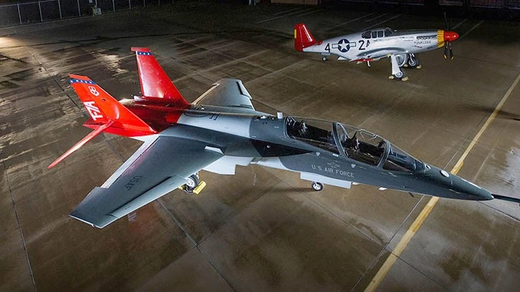 The T-7A Red Hawk, manufactured by Boeing, introduces capabilities that prepare pilots for 5th-generation fighters, including high-G environment, information and sensor management, high angle of attack flight characteristics, night operations, and air-to-air and air-to-ground skills.
