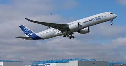 The first Airbus A350 XWB, designed as an efficient, large twin-engined commercial aircraft, began its maiden flight at Blagnac in Toulouse, France, Friday morning. Its first flight lasted four hours and five minutes. An international crew of six was on board, comprising two flight test pilots, one test flight engineer and three flight test engineers.