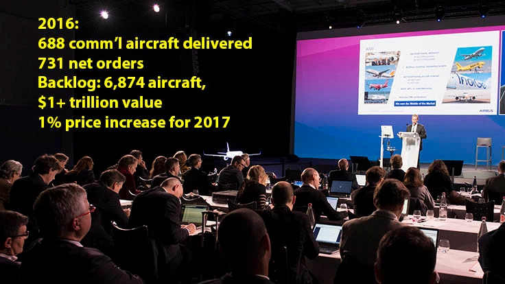 Airbus achieved 731 net orders from 51 customers of which eight are new. These included 607 single-aisle and 124 wide-body aircraft. At the end of 2016, Airbus’ overall backlog stood at 6,874 aircraft valued at $1.018 trillion at list prices.