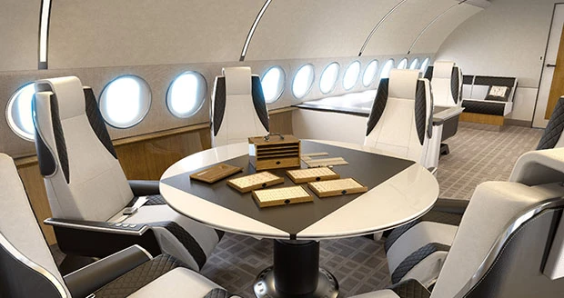 Elegance combines today’s ACJ319 airframe with a new cabin that allows customers to choose from a wide range of lounge, office, dining, and conference modules, complemented by a bathroom and galley at the front and a bedroom with ensuite bathroom at the rear.