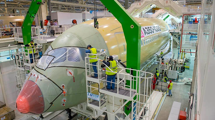 Currently in Station 50 for fuselage join-up and nose landing gear installation, the first A350-1000 will next move to Station 40 where the wings, main landing gear, pylons, and tail planes will be installed. To save time and optimize the A350 assembly process, Airbus starts the cabin furnishing and first electrical power-on in parallel to the structural assembly work. After this stage is completed, the aircraft continues through the FAL process, with final structural activities, ground tests, painting, cabin & cockpit completion, and engines installation before being transferred to the flight test center.