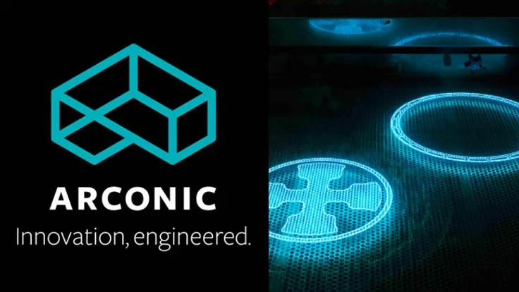 Arconic logo with 3D printed polymer prototype patterns for aero engine components made in Whitehall, Michigan.