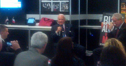 Apollo 11 astronaut, Buzz Aldrin, speaks to a group in the U.S. Pavilion at the Paris Air Show about landing on the moon. His new book, published by National Geographic, is entitled, Mission to Mars: My Vision for Space Exploration, written with Leonard David.