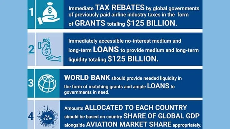 - Immediate tax rebates by global governments of previously paid airline industry taxes as $125 billion in grants