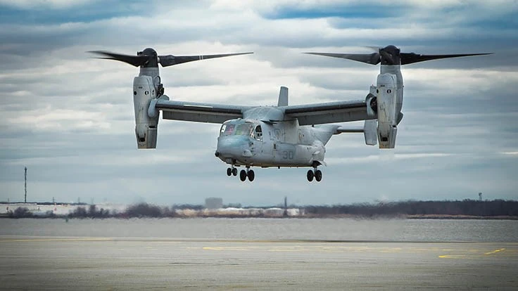 A Bell Boeing MV-22 Osprey arrives at Boeing’s Philadelphia site as the first aircraft of the V-22 Common Configuration-Readiness and Modernization (CC-RAM) program.