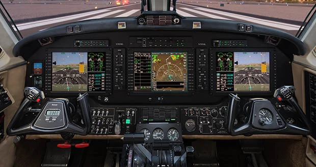 The AeroVue integrated flight deck provides a completely new avionics suite for Beechcraft King Air 200 and B200 operators, including a flight management system with vertical navigation, digital autopilot, SmartView synthetic vision, a cursor control device, and three 12" advanced LCD screens. Additional features of the AeroVue system include: