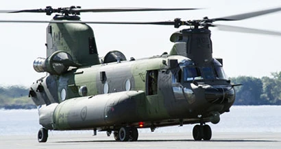 The CH-147F Chinook is an advanced, multi-mission helicopter that features a modernized airframe with a long-range fuel system allowing it to fly twice as far as standard range models.