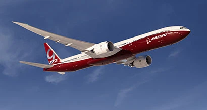 The 777X introduces the latest technologies in multiple places, including the advanced commercial engine – the GE9X by GE Aviation – and an all-new high-efficiency composite wing that has a longer span than today's 777. The airplane's folding, raked wingtip and optimized span deliver greater efficiency, significant fuel savings, and complete airport gate compatibility.