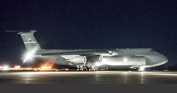 The C-5M was loaded with pallets, fuel and the aircrew for a total of 731,220 lb, including the weight of the plane.