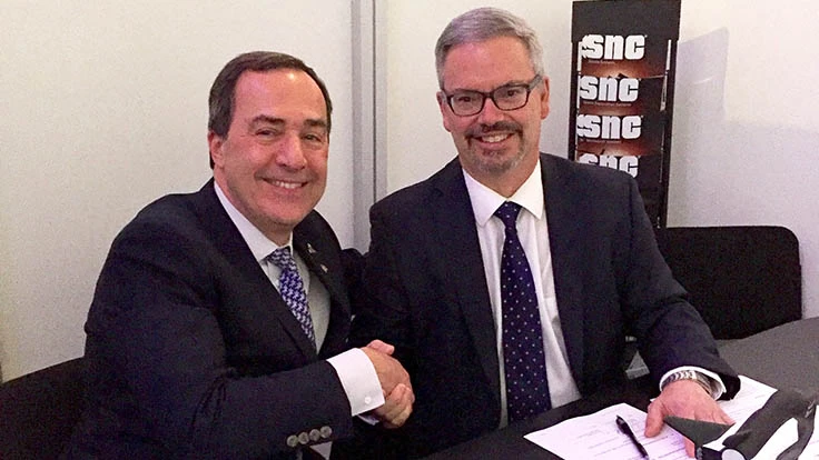 Mark Sirangelo, corporate vice president of SNC’s Space Systems business, and Sylvain Laporte, CSA president. (CNW Group/Canadian Space Agency)