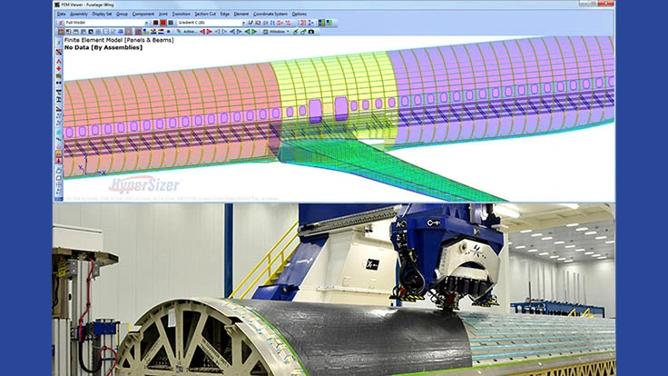 NASA’s Advanced Composites Consortium members will plug their analysis tools into the HyperSizer Stress Framework for rapid airframe analysis (above) and design optimization of robotic automated fiber placement (AFP) manufactured structures (below).