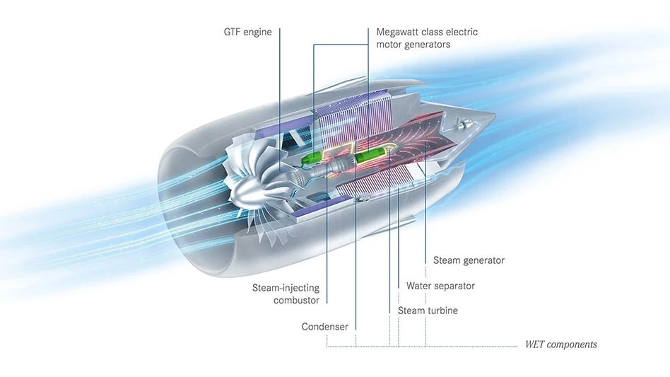 The hybrid-electric GTF powertrain will enable even greater efficiency across all phases of flight by leveraging highly efficient megawatt-class electric motor generators, power electronics, and batteries to optimize the performance of the fuel-burning gas turbine. The WET concept recovers water vapor from the engine exhaust and re-injects it into the combustion chamber to significantly improve fuel efficiency, reduce NOx emissions, and lessen contrail forming emissions. These revolutionary technologies are designed to work together to deliver a step-change reduction in emissions and energy use across the full operating system, while maintaining world-class reliability and operability.
