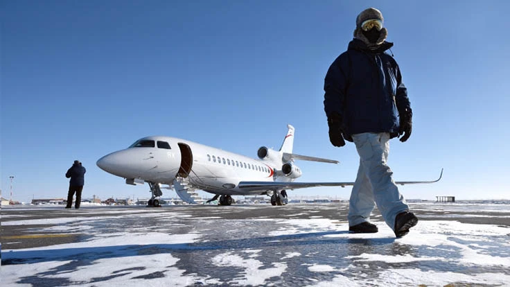 After undergoing thermal, acoustic, and cabin amenity testing at the Little Rock Completion Center, s/n 03, the first 8X equipped with a fully fitted interior, returned to the Istres Flight Test Center near Marseille earlier this month to prepare for cold soak trials. Intended to demonstrate aircraft system functionality under extreme weather conditions, the soak trial campaign was conducted at Ranken Inlet, Nunavut, on the northwestern shore of Canada's Hudson Bay, from March 9-11, 2016.