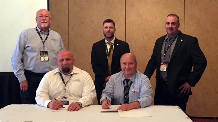 Derco Vice President Mark Konzal (center) and Technical Solutions Manager Rich Latus (right) join Chief Systems Engineer Kaan Tuncel (seated right) in signing the distribution agreement with Arkwin Business Unit Manager Bernard Kierez (seated left) and Sales Engineer Peter Muenzen (left).