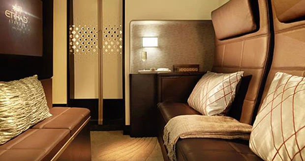 The First Suite on the Etihad Airways B787 offers guests an enhanced suite with chilled mini-bar, complete privacy, and center seats, which can be joined to create a double bed.