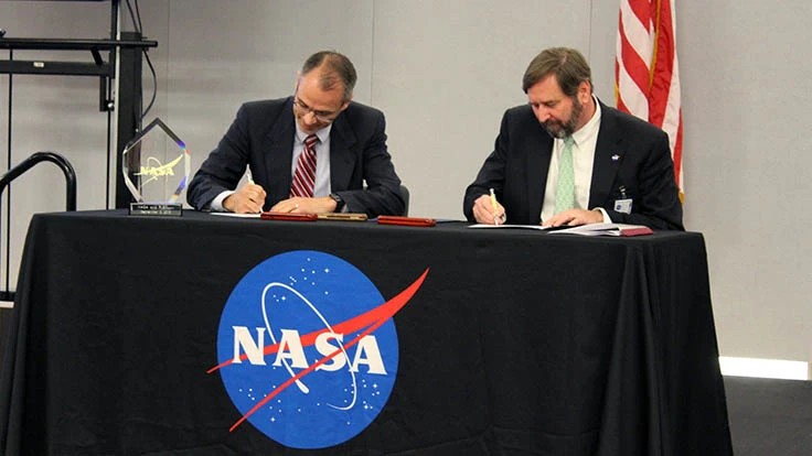 NASA Glenn Director Jim Free and Neil McDonough, FLEXcon president and CEO, sign agreement licensing polyimide aerogels.