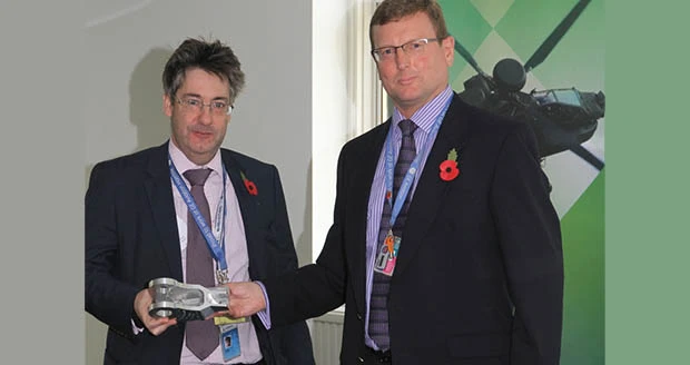 Trevor Higgs, Airbus, Head of Wing (left), receives the first A350-1000 metal cut part (Spoiler 1 Hinge Bracket) from John Hunt (right), GE Aviation, director of Manufacturing Technology.