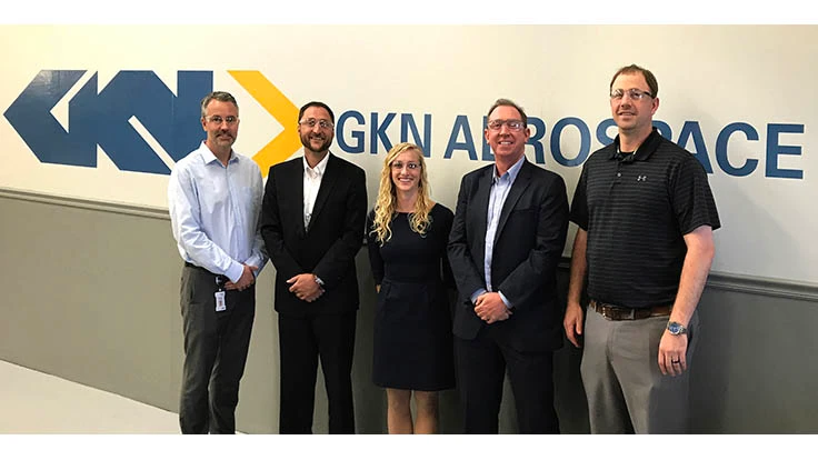 Signing celebration between GF Machining Solutions LLC and GKN Aerospace. Left to right: Martin Thorden, general manager and vice president, GKN Aerospace Engine Systems New England; Philipp Hauser, head of Turbine Group – Liechti, GF Machining Solutions LLC; Jennifer Riley, supply chain director, GKN Aerospace Engine Systems New England; Mike Costello, sales manager North America / Turbine Group – Liechti, GF Machining Solutions LLC; Jon Ford, director of engineering, GKN Aerospace Engine Systems New England.