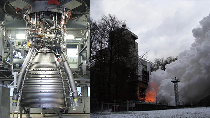 GKN Aerospace sandwich nozzle, the main upgrade on the Vulcain 2.1 engine for Ariane 6, hot fire demonstrated at DLR (German Aerospace Centre). (Photo: DLR)