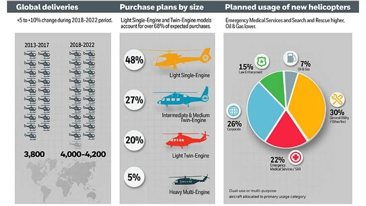 With a better long-term global economic outlook this year, customers are holding firm in their intentions to invest in new helicopter purchases over the next five years. In its 20th annual “Turbine-Powered Civil Helicopter Purchase Outlook,” Honeywell forecasts 4,000 to 4,200 new civilian-use helicopters will be delivered from 2018 to 2022, aligning with the 5-year forecast from 2017.
