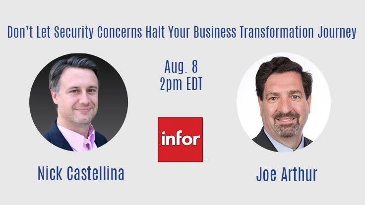 You are invited to a webinar on August 8, 2019 at 2:00 pm EST, featuring Infor’s Nick Castellina, Director of Industry and Solution Strategy, and Joe Arthur, Vice President of Government SaaS, to learn about how your business can ensure compliance for its applications in the aerospace and defense industry. During this event, you will learn: