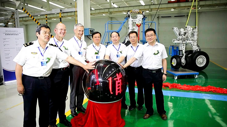 Toulouse, France – On Sept. 27, 2016, Liebherr LAMC Aviation (Changsha) Co. Ltd., the joint venture between the Chinese company LAMC (AVIC Landing Gear Advanced Manufacturing Corp.) and German-based Liebherr-Aerospace Lindenberg GmbH, celebrated the delivery of its first ARJ21 main landing gear assembled in China to aircraft manufacturer COMAC.