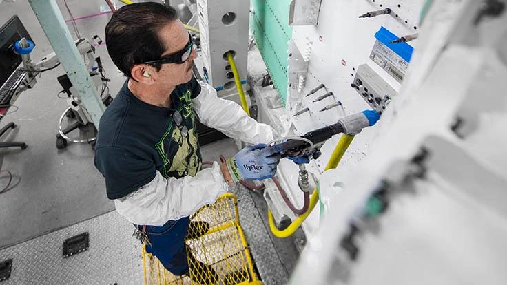 Lockheed Martin aircraft assembler Daniel Molina uses a power feed drill motor using forced mechanical oscillation to reduce chip size. The improved chip formation reduces drill times, improves hole quality, and increases tool life for deep-stack drilling. (Lockheed Martin photo)