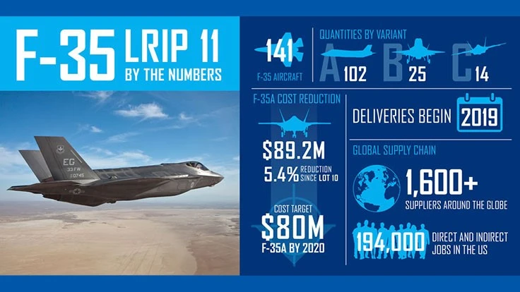 The cost of an F-35A was lowered for the 11th consecutive year. Unit price for the F-35A including aircraft, engine, and fee is $89.2 million. This represents a 5.4% reduction from the $94.3 million it cost for an F-35A in low-rate initial production lot 10 (LRIP 10).