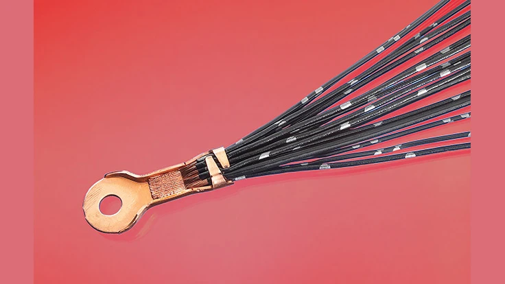 “Our technology is adaptable and our equipment is engineered to satisfy the needs of manufacturers in a variety of fields, including those requiring customized tooling,” says Devine. Sonobond units are routinely used to weld stranded wire-to-wire and wire-to-terminal for electrical wire harness and bus bar applications.  They can weld multiple layers of thin aluminum, copper, and nickel foil to itself or to battery terminals and components of fuses/circuit breakers, ignition modules, and photovoltaic panels. One version of our equipment can also seal HVAC tubing, replacing crimp and solder methods.