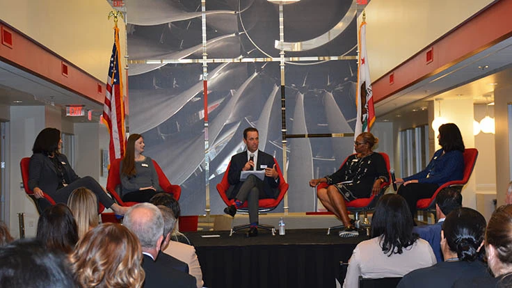 Panelists for the Women in Aerospace roundtable at Meggitt Control Systems in Simi Valley were (left to right): Dolores Watai, vice president of finance; Karlyn Eoff, director of program management; U.S Congressman Steve Knight (CA-25); Greer Bosworth, assistant general counsel; Sarah Bergagnini, systems engineering manager.