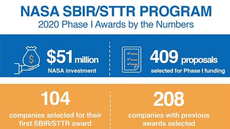 NASA has selected 409 technology proposals for the first phase of funding from the agency’s Small Business Innovation Research (SBIR) and Small Business Technology Transfer (STTR) program. The contracts will provide approximately $51 million to 312 small businesses in 44 states and Washington, D.C.