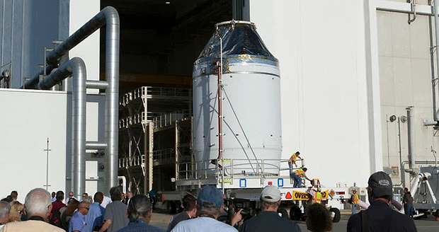 NASA, Orion's prime contractor Lockheed Martin, and ULA managers oversaw the move of the spacecraft from the Neil Armstrong Operations and Checkout Building to the Payload Hazardous Servicing Facility at Kennedy, where it will be fueled with ammonia and hyper-propellants for its flight test. Once fueling is complete, the launch abort system will be attached. At that point, the spacecraft will be complete and ready to stack on the Delta IV Heavy.