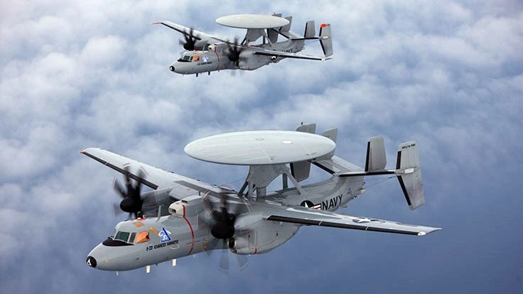 The E-2D is the U.S. Navy’s airborne early warning and command and control aircraft system. The carrier-based aircraft provides expanded battlespace awareness for carrier strike groups. Its two-generation leap in radar technology allows the E-2D to work with ship-, air-, and land-based combat systems to track and defeat air, ship, and cruise missiles at extended range. The aircraft can also be used in a humanitarian assistance and disaster relief capacity for civilian emergency coordination.