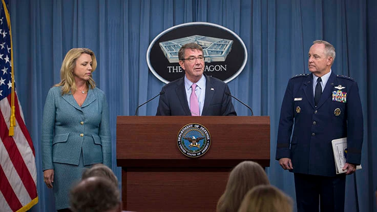 Defense Secretary Ash Carter, center, Air Force Secretary Deborah Lee James, and Air Force Chief of Staff Gen. Mark A. Welsh III announce the long range strike bomber contract award at the Pentagon. (U.S. Air Force)