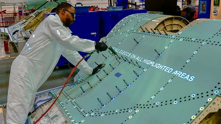 Northrop Grumman mechanic uses FILLS light projected work instructions to speed the assembly of an F-35 center fuselage.