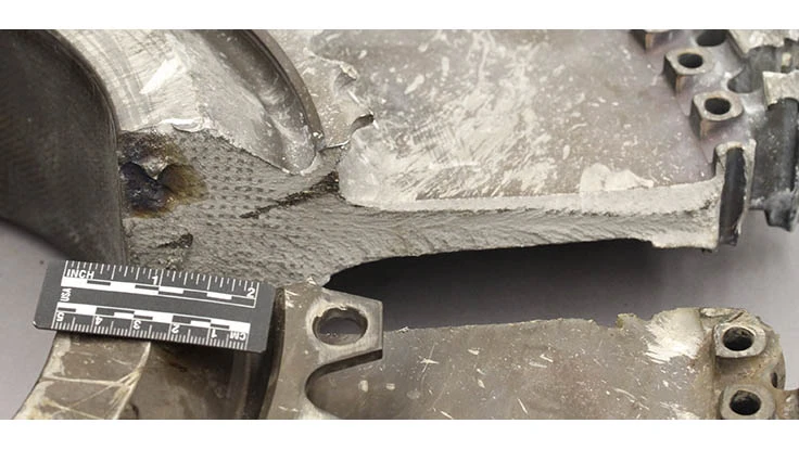 Most of the stage 2 disk was recovered and sent to the NTSB laboratory in Washington, D.C. for examination. One of the fractures exhibited features consistent with fatigue cracking initiating at an internal inclusion near the forward side of the hub’s inner bore.