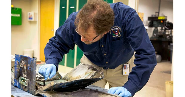 NTSB Materials Engineer Matt Fox examines the casing from the battery