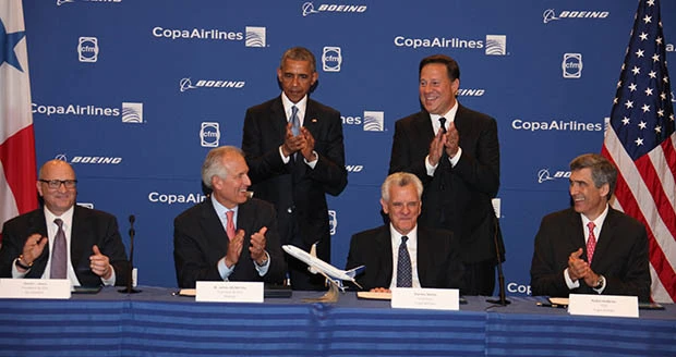 Panama City – Panama President Juan Carlos Varela Rodriguez and U.S. President Barack Obama witnessed a historic agreement in which Copa Airlines and Boeing officials announced an order for 61 737 MAX 8 and MAX 9 airplanes. The order, valued at $6.6 billion at list prices, is the largest commercial transaction ever between a Panamanian and a U.S.-based company.