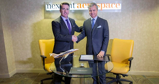 Nextant President and CEO Sean McGeough and PlaneSense President and CEO George Antoniadis shake hands after signing the purchase agreement.