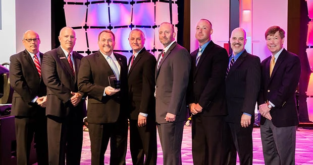 PPG officials accepting the award. From left are Bill Williams, Gulfstream vice president of supply chain initial and final phase; Greg Collett, Gulfstream vice president of initial and final phase operations; Will Wenck, PPG program director – Gulfstream; Nigel Thomas, PPG transparencies segment manager, general aviation; Mark Hood, PPG global market director, general aviation transparencies products; Adam Kennamer, PPG transparencies product support engineer; Derek Zimmerman, Gulfstream vice president of product support; and Dennis Stuligross, Gulfstream senior vice president of operations.